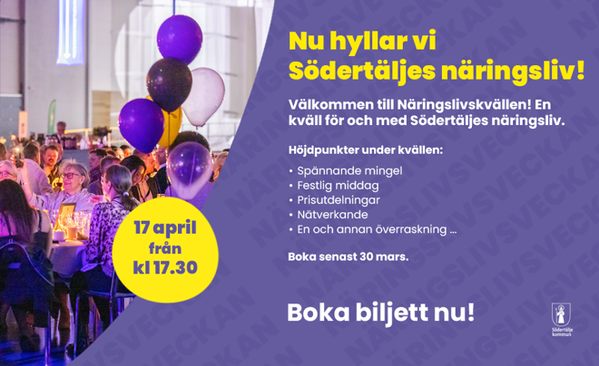 Näringslivskvällen är en del av Näringslivsveckan – Tillsammans för Södertäljes näringsliv. Fredagen den 17 april bjuder vi in till en kväll på Tom Tits Experiment med mingel, middag, prisutdelning och underhållning.