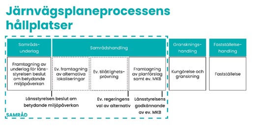 I början av planläggningen av en ny järnväg tas ett samrådsunderlag fram som beskriver hur projektet bedöms påverka miljön. Underlaget ligger till grund för Länsstyrelsens beslut om projektet kan antas medföra en betydande miljöpåverkan. Enskilda som kan antas bli särskilt berörda ska få möjlighet att yttra sig på samrådsunderlaget innan beslutet tas.