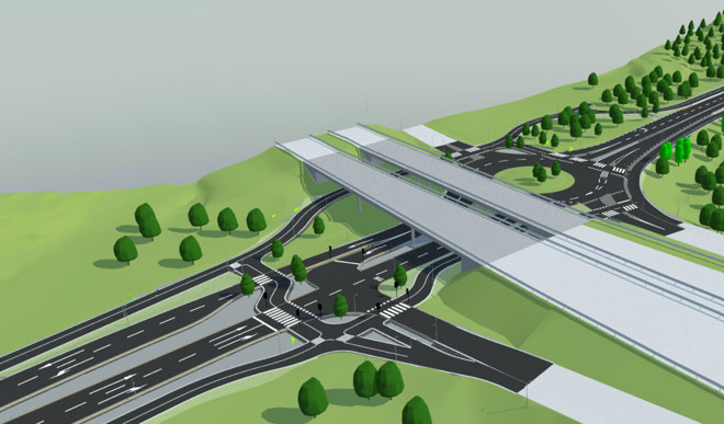 Bilden ovan visar en illustration av den nya trafiklösningen vid uppfarten mot motorvägen E4/E20 (Trafikplats Saltskog). Där kommer rondellen att bytas ut mot ett trafikljus för skapa jämnare trafikflöden. Illustration: Strid & Lundberg
