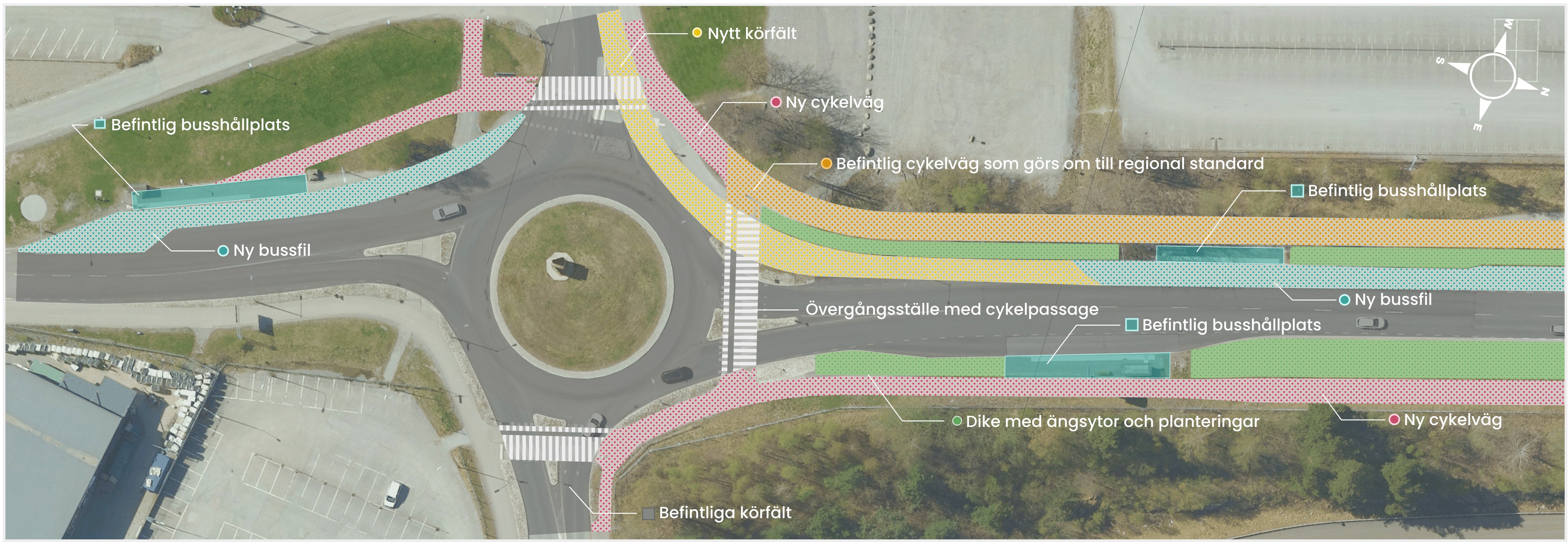 Genom att bygga nya, separata busskörfält, nya gång- och cykelvägar samt införa signalprioritering för buss ska restiderna sänkas, särskilt under rusningstid.
