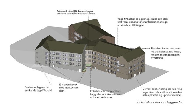Vård- och omsorgsboendet får 80 lägenheter och blir fem våningar hög, inklusive suterrängvåning. Byggnaden kommer att ha anpassade lägenheter, gemensamma ytor utomhus med trädgård, samt parkering för bil och cykel. Byggnaden är uppdelad i tre byggnadskroppar/flyglar som hålls samman av ett centralt trapphus, vilket möjliggör för bra dagsljus i hela huset. En innergård kommer omslutas av två av de norra flyglarna. Fasaderna blir till största del i tegel i ljus, beige och brun färg. I förslaget finns också planer på solceller på taket.