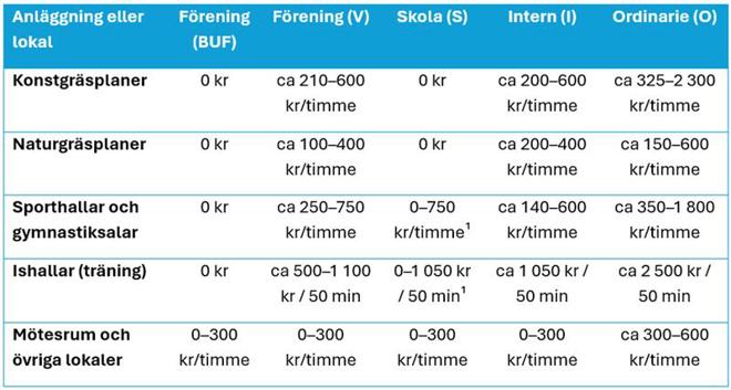 · BUF – Bidragsberättigade föreningar med Barn- och ungdomsverksamhet (0–20 år) och verksamhet för personer med funktionsnedsättning. Träning och matcher är kostnadsfria (nolltaxa) på alla idrottsanläggningar.