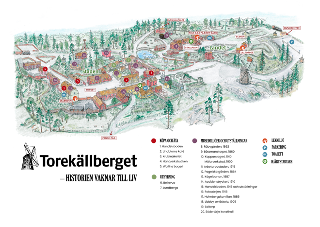 Kliv rakt in i historien på friluftsmuseet Torekällberget. Här möter du äldre bebyggelse, odlingar och lantrasdjur som berättar om livet i södertäljetrakten på 1800-talet. Flera av husen har inredda historiska miljöer. Titta efter KIKA IN-skylten när du strosar runt. I hagarna runt bondgården och torpet går svenska lantraser: kaniner, getter, får, hästar, grisar, kor, höns och gäss. Missa inte heller våra trädgårdar och odlingstäppor där vi odlar äldre sorters växter.
