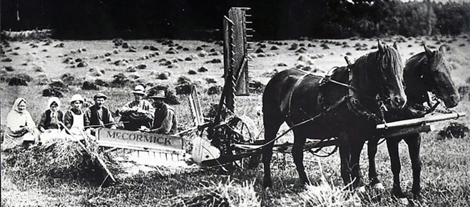 Skördearbete med häst under tidigt 1900-tal. Fotosamling: Hilmer Larsson/Torekällbergets museum.