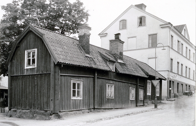 Huset på ursprunglig plats på Jovisgatan 7, Södertälje på 1920-talet. Huset är det mörkare trähuset med brutet tak på vänster sida om gatan, framför det höga vita stenhuset. Fotograf: Torgny Dufwa