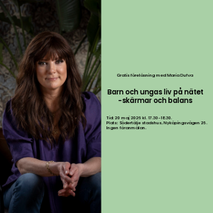 Den 20 maj föreläser Maria Dufva på Estrad i Stadshuset. Föreläsningen riktar sig till ungdomar och vuxna som vill förstå mer om skärmar, makt och balans – och få konkreta tips på vad man kan börja göra för en sundare skärmkultur.