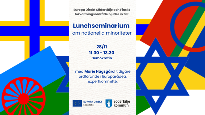Var tionde av Sveriges befolkning utgör någon av de nationella minoriteterna. Vad innebär den svenska lagstiftningen och hur arbetar EU för att skydda minoriteter? Varmt välkommen på ett seminarium tillsammas med Marie Hagsgård, tidigare ordförande i Europarådets expertkommitté på nationella minoriteter.
