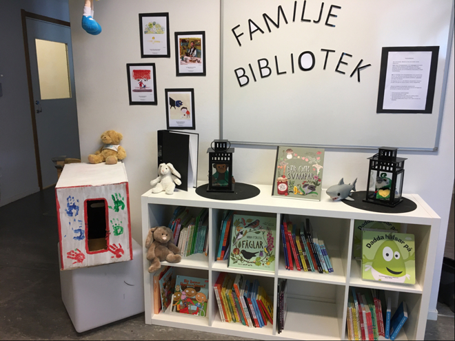 Ett av familjebiblioteken i Östertälje förskoleområde. Här kan barnens familjer låna med sig barnböcker hem.
