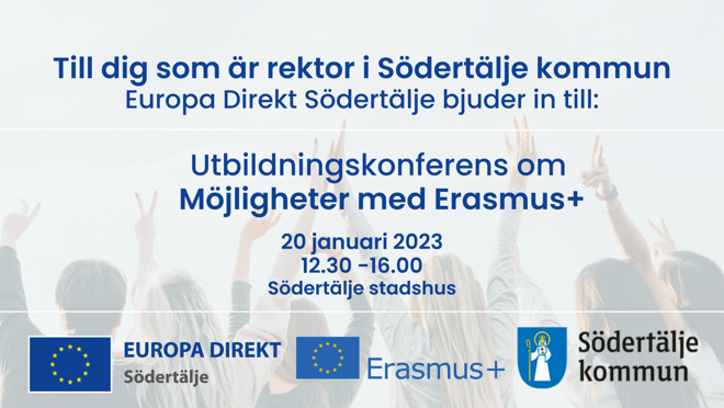 Vill vi härmed bjuda in dig som är rektor på din skola till en utbildningskonferens på temat ”Möjligheterna med Erasmus+”. Under denna eftermiddag får ni tillfälle att inspireras och lära er mer om hur ni har möjlighet att ta del av de 26,2 EU-miljarder som finns tillgängliga inom Erasmus+ utbildningsprogram. Det handlar framför allt om hur din skola kan få bidrag för kompetensutveckling av dig som rektor, din skolledning och dina lärare och övrig personal på skolan.