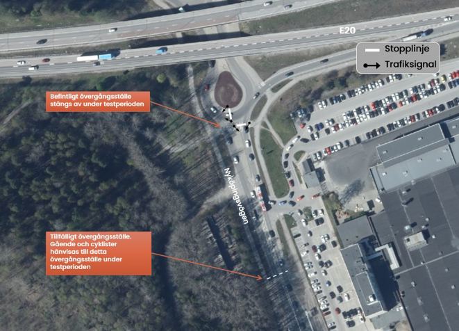 Trafikmätningen innebär att vi kommer att testa två tillfälliga trafiksignaler vid cirkulationsplatsen. Ett övergångställe kommer att stängas av under testperioden och gång- och cykeltrafik hänvisas till ett tillfälligt övergångställe, se kartbild nedan.