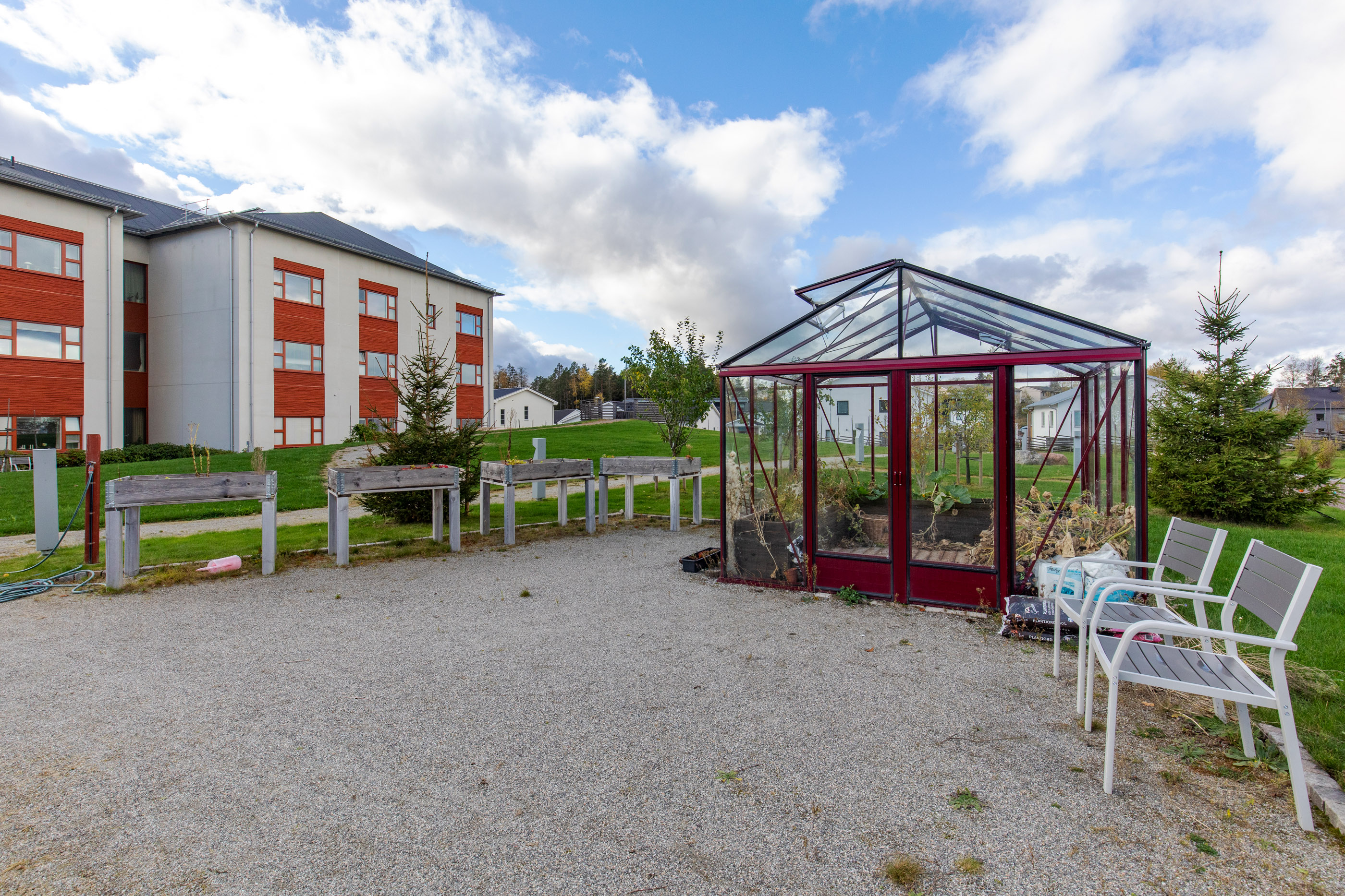 Vi har en stor lummig trädgård med både stenlagda ytor och gräsmatta. Genom trädgården går en promenadslinga och det finns flera sittgrupper utplacerade att stanna till vid en stund. Här finns också ett område med odlingslådor samt ett växthus för den som är trädgårdsintresserad.
