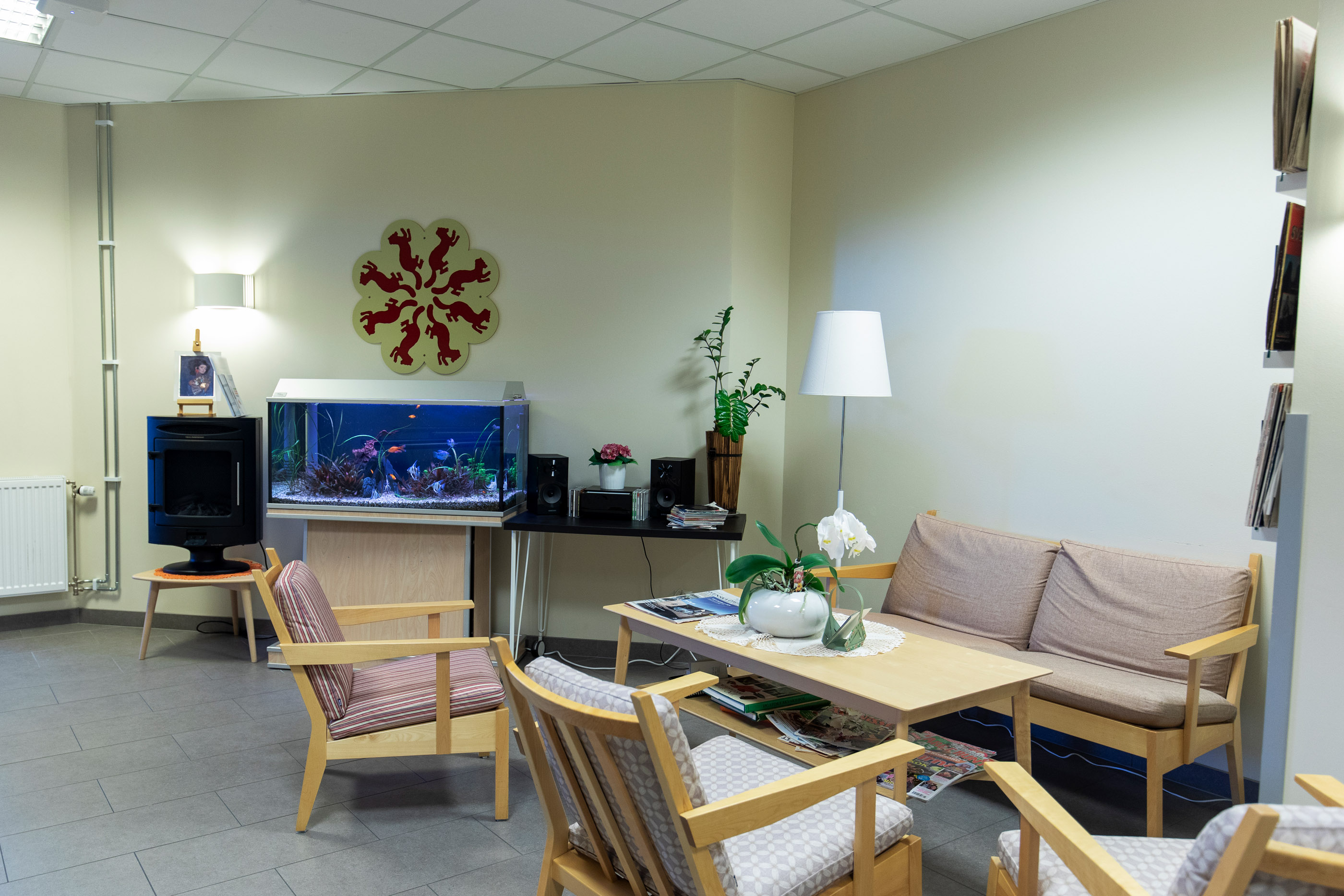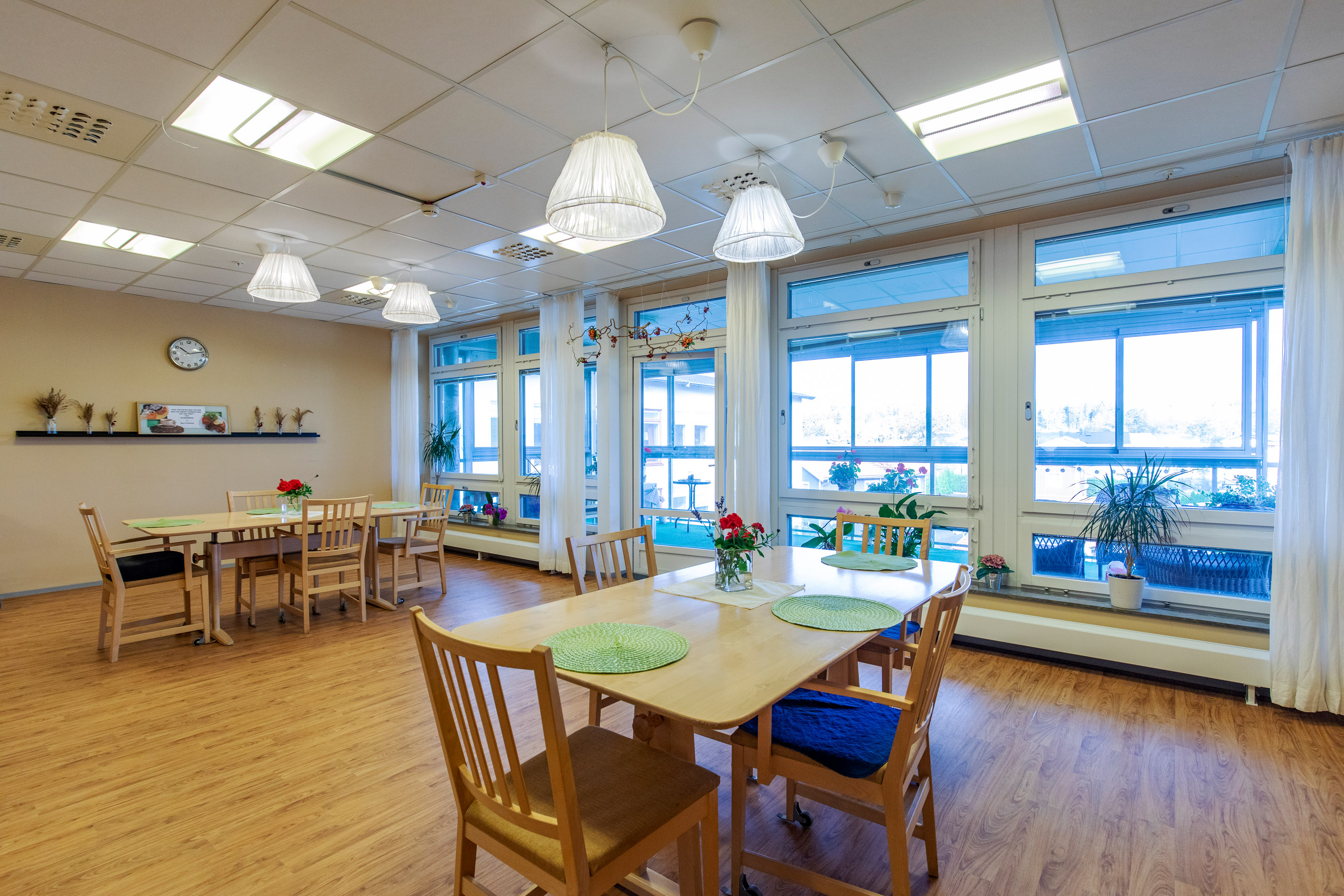 På entréplan har vi en stor gemensam samlingssal där många av våra aktiviteter sker och ett terapirum dit du kan gå för att sy, måla eller lägga pussel. Samlingssalen kan du och din anhörige låna för att till exempel fira din födelsedag. Det finns porslin, kaffebryggare, mikrovågsugn och diskmaskin till ditt förfogande.