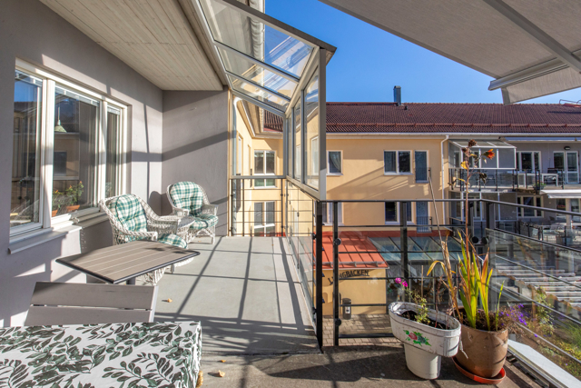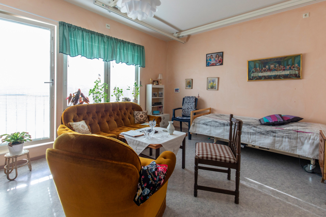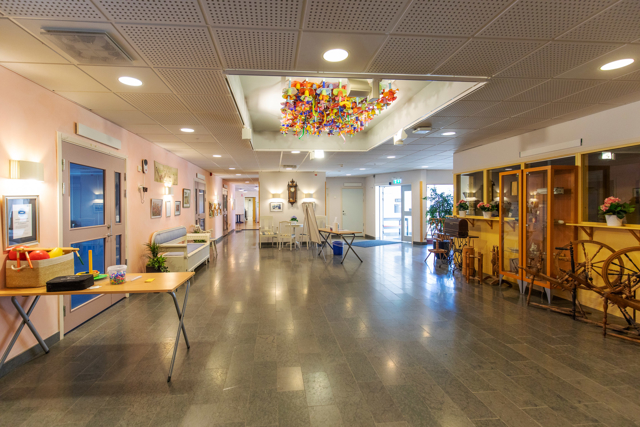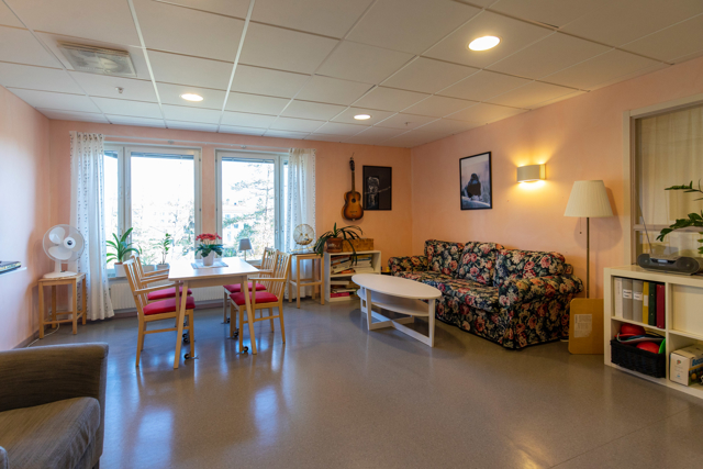 Varje bostadsgrupp har gemensamt bondkök och trivsamt vardagsrum som en naturlig samlingspunkt för samvaro och måltider. På vardera våningsplanet finns en stor aktivitetshall där vi samlas för bostadsspecifika sociala och fysiska aktiviteter. Från flera av bostadsgrupperna har du tillgång till en stor balkong, delvis inglasad där vi kan njuta av utevistelse oavsett väder. Under sommaren förgyller vi balkongen med grönska och blommor för extra trevnad. På entréplan har vi en gemensam samlingssal där många av våra aktiviteter äger rum. Här ligger även ett värdshus, som tillreder vår lunch och vår middag.
