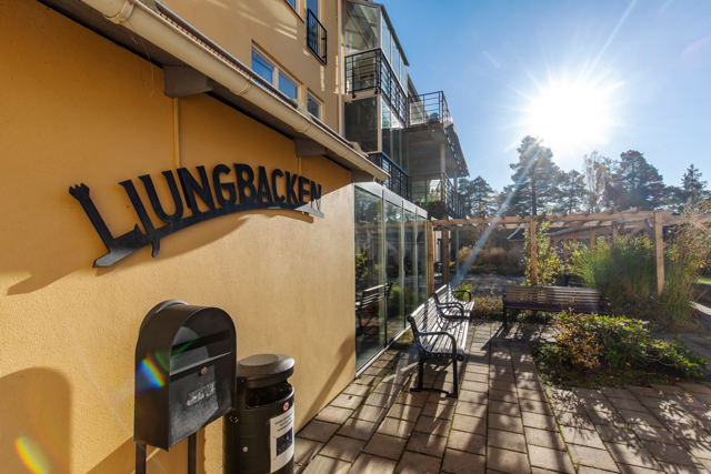 Ljungbacken vård- och omsorgsboende ligger invid ett skogsområde i närheten av Järna centrum. Boendet består av 60 lägenheter och vänder oss till dig med stora och små omvårdnadsbehov eller med demenssjukdom. Fotograf: Liza Simonsson
