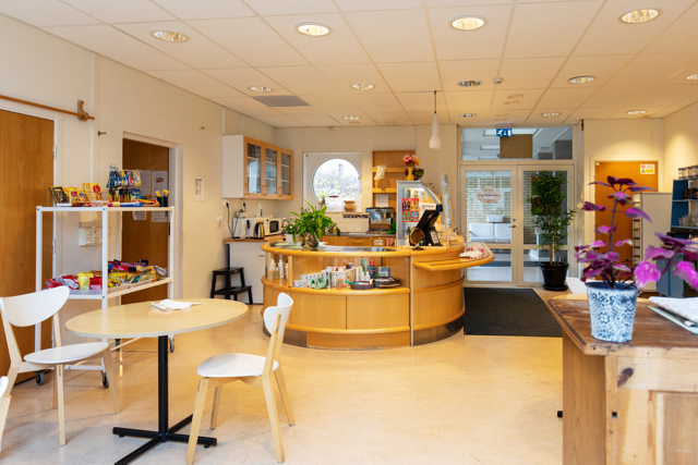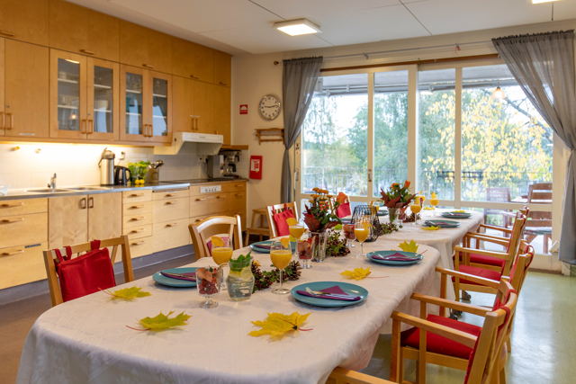 På entréplan har vi en gemensam samlingslokal där många av våra aktiviteter äger rum, en ateljé samt ett café som drivs av en av kommunens dagverksamhet. Samlingslokalen kan du som anhörig och närstående låna vid kalas