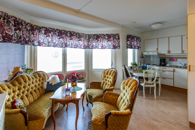 Varje avdelning har gemensamma utrymmen med kök, matrum, vardagsrum och balkong. I trapphuset finns det en tvättstuga.